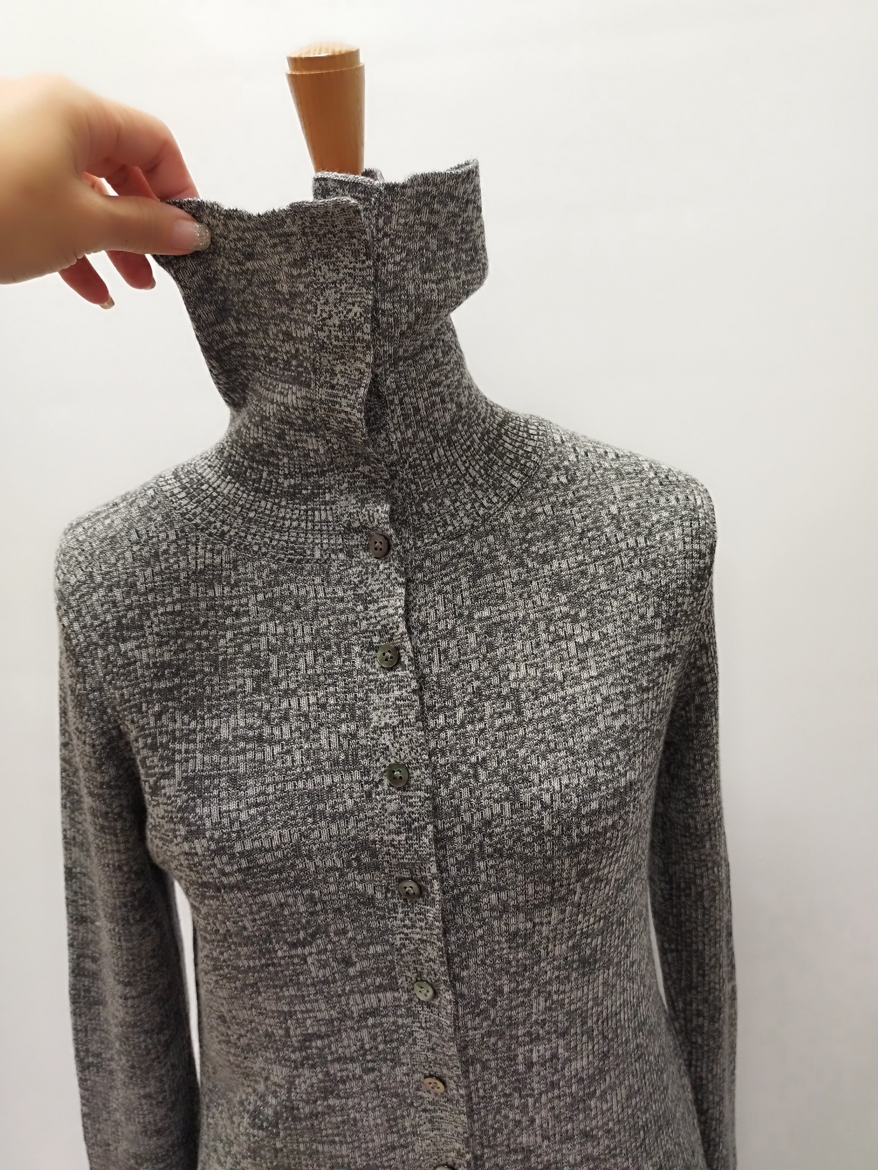 ボタンがネック上まであり、留め方でアレンジ可能