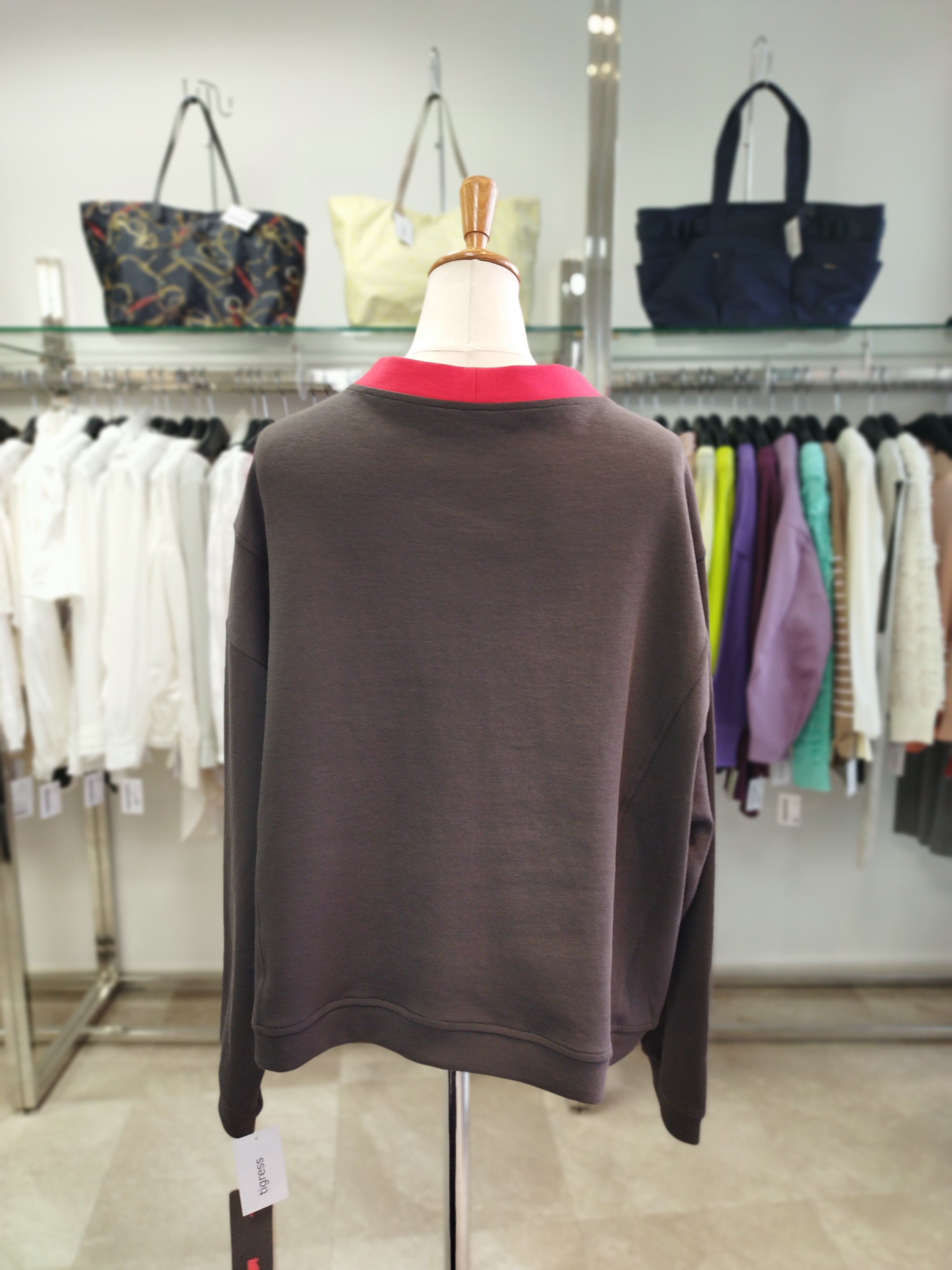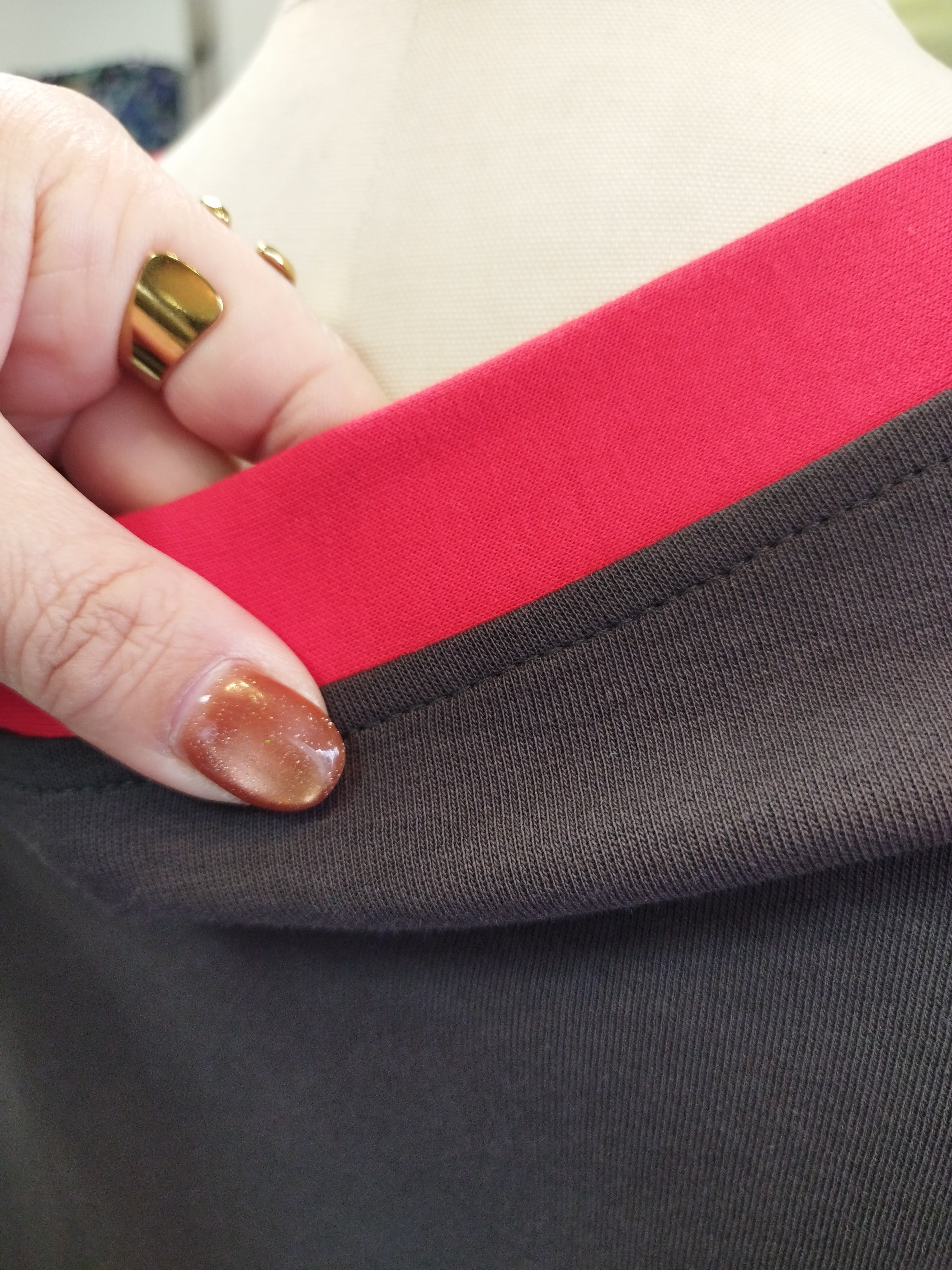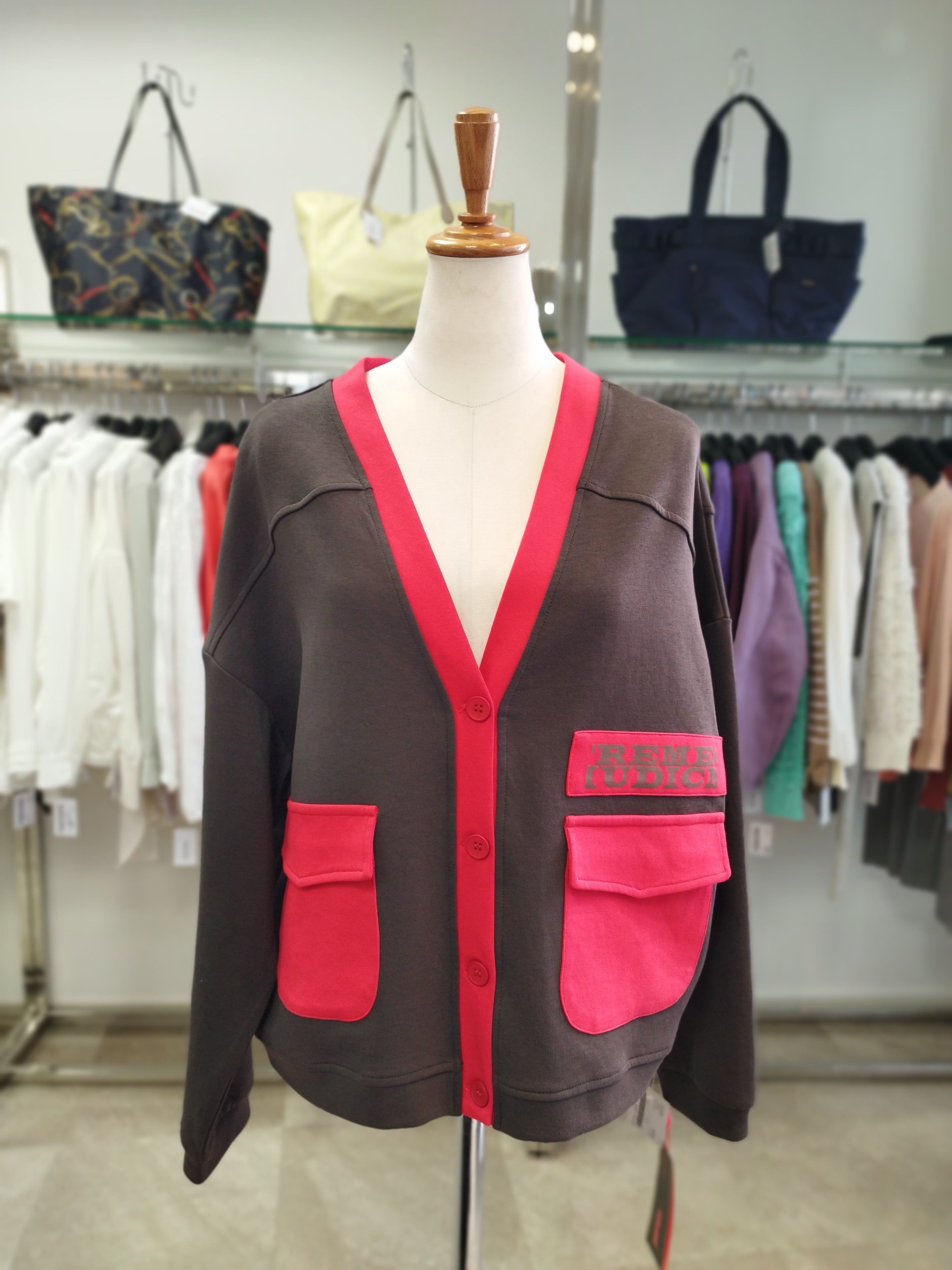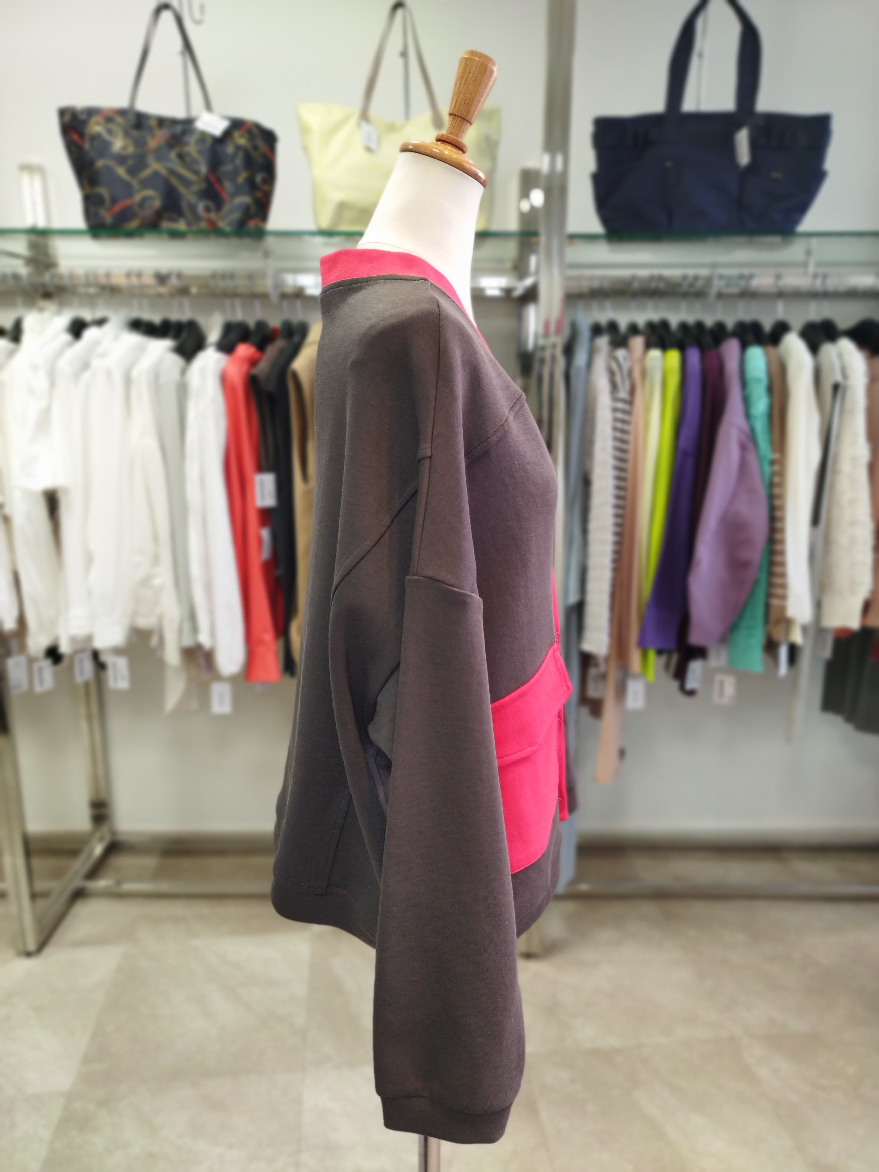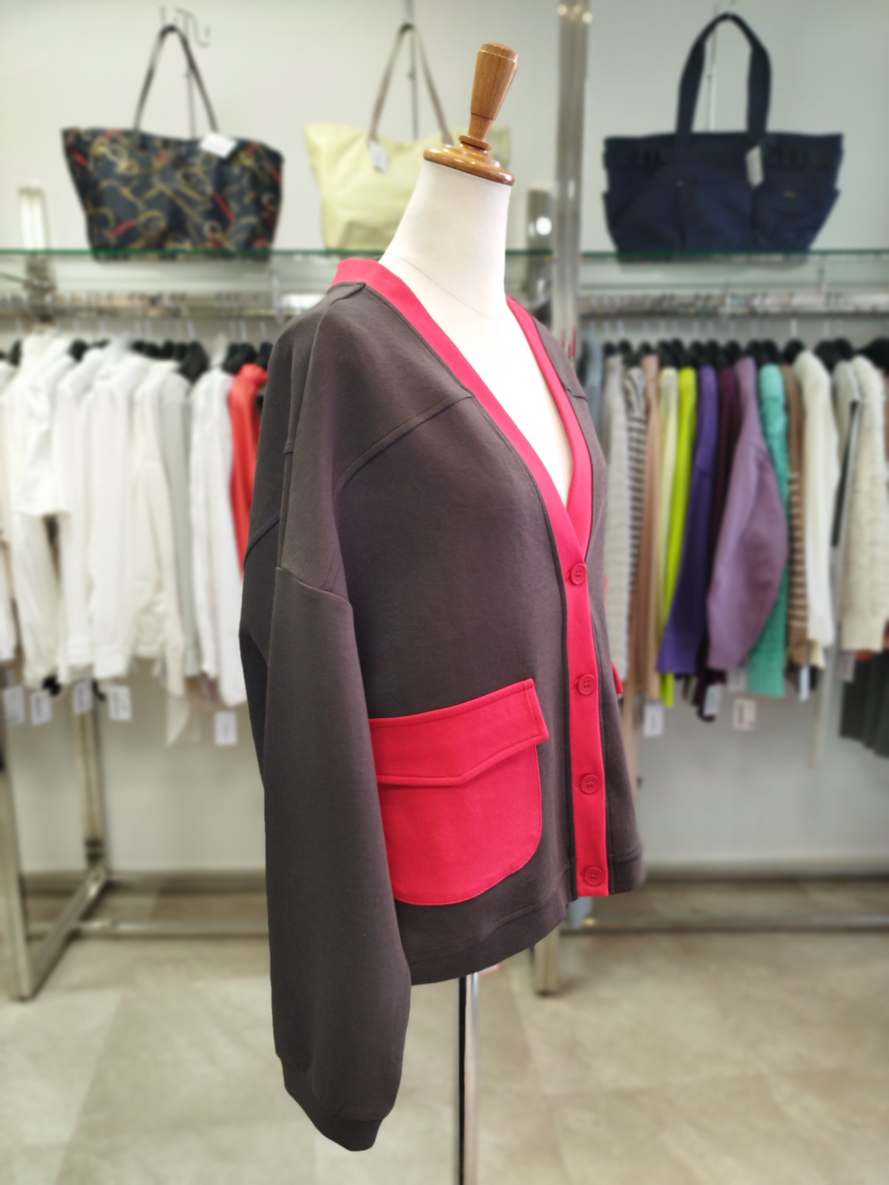 ブラウンと赤のバイカラー 着丈54目安